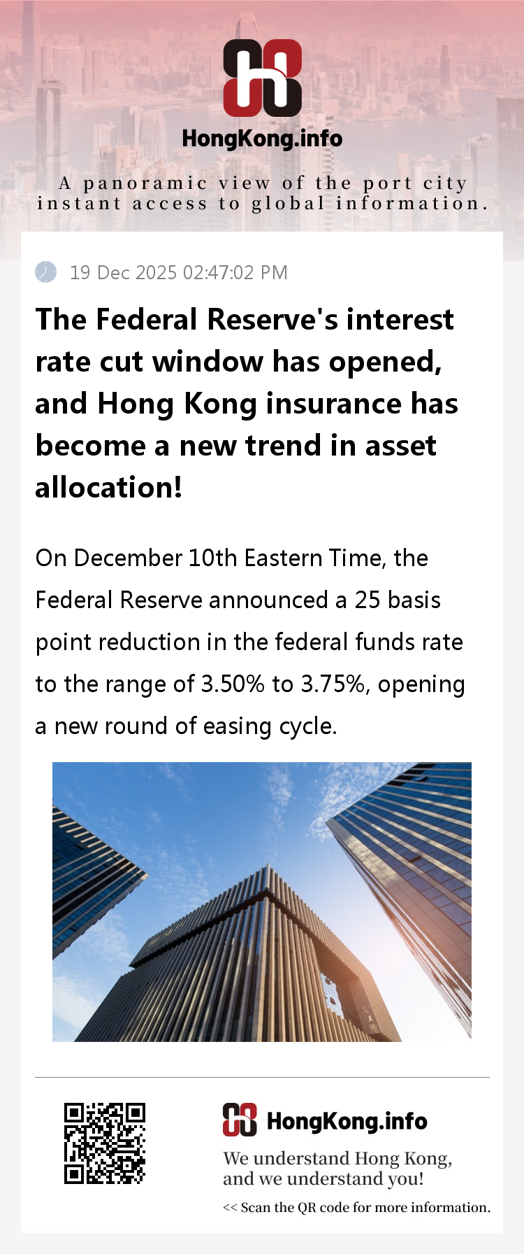 On December 10th Eastern Time, the Federal Reserve announced a 25 basis point reduction in the federal funds rate to the range of 3.50% to 3.75%, opening a new round of easing cycle. Influenced by the Hong Kong linked exchange rate system, this policy quickly spread to the Hong Kong dollar market, but did not weaken the attractiveness of Hong Kong insurance. Instead, with its unique asset allocation logic, it became a high-quality choice in the global asset restructuring wave, attracting more and more investors who pursue stable returns.