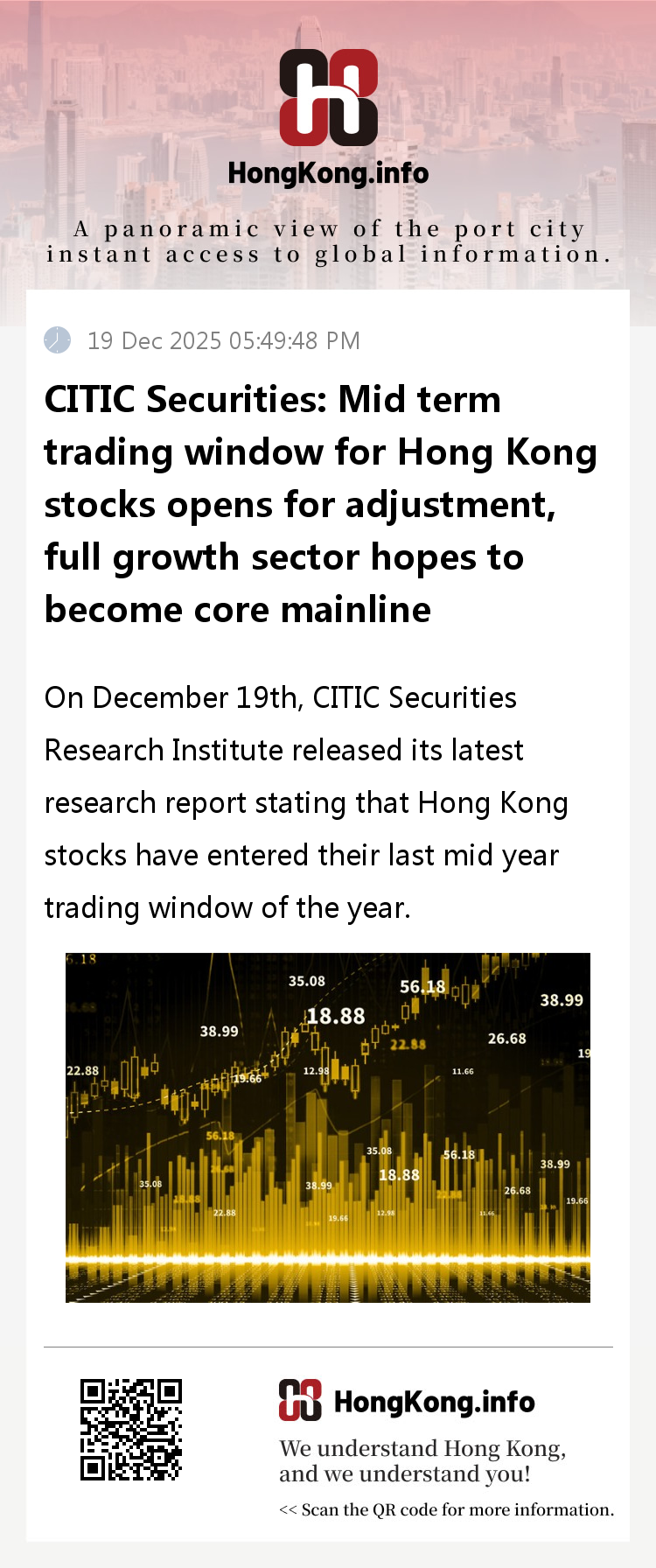 On December 19th, CITIC Securities Research Institute released its latest research report stating that Hong Kong stocks have entered their last mid year trading window of the year. After experiencing a unilateral rise in September, Hong Kong stocks have been subject to fluctuating adjustments due to overseas macro expectations since October. Currently, the AH and other two markets have simultaneously completed mid-term adjustments, and some high-quality Hong Kong stock assets have returned to the high cost-effectiveness range. Coupled with the resonance effect of continuous allocation of Beishui, recovery of profit expectations, and improvement of year-end macro expectations, Hong Kong stocks are entering a period of trading opportunities that cannot be ignored.