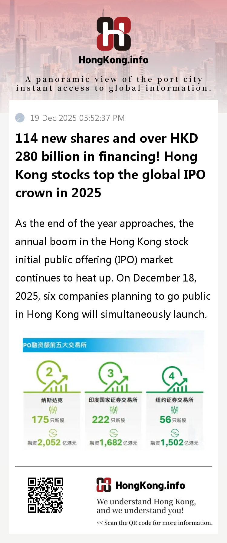 As the end of the year approaches, the annual boom in the Hong Kong stock initial public offering (IPO) market continues to heat up. On December 18, 2025, six companies planning to go public in Hong Kong will simultaneously launch their IPOs, all of which are scheduled to be officially listed on December 30, 2025. The Hong Kong stock market will celebrate its peak as the world's number one IPO market with a lively scene of "six gongs ringing together".