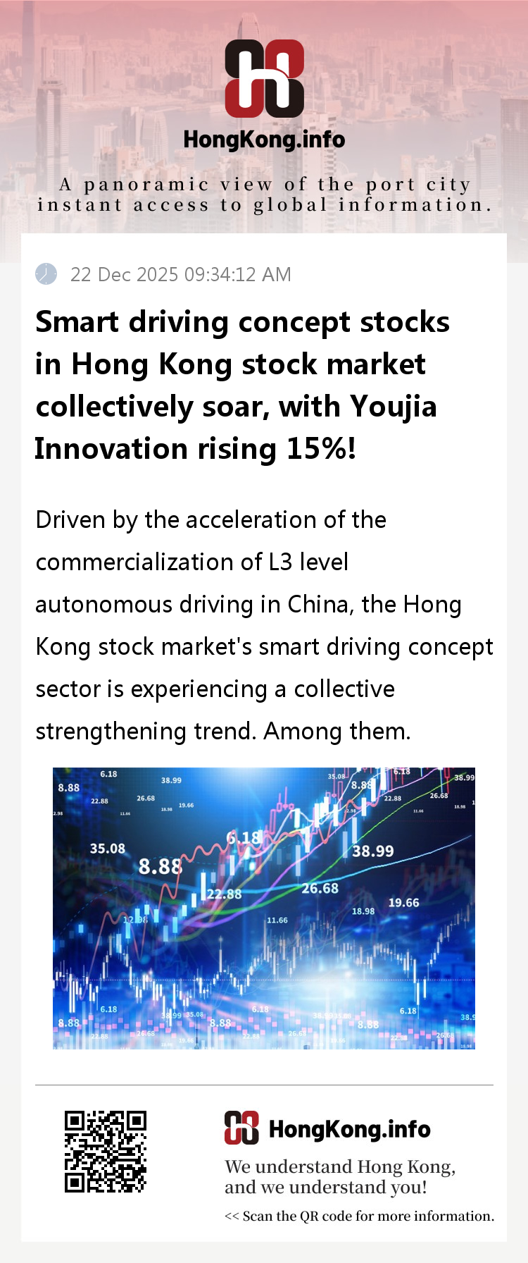 Driven by the acceleration of the commercialization of L3 level autonomous driving in China, the Hong Kong stock market's smart driving concept sector is experiencing a collective strengthening trend. Among them, the core target Youjia Innovation saw a significant increase of 15%, followed closely by Zhejiang Shibao, which rose nearly 12%; Horizon Robos-W rose 7%, while Xiaopeng Auto-W and Black Sesame Intelligence both saw gains of over 4%; Lidar and intelligent driving solution suppliers also showed active performance, with Sagitar Juchuang, Hesai-W, and Zhixing Technology rising by over 3%, while Xiaoma Zhixing-W, Zero Run Automotive, and others also achieved a 2% increase, showing a general upward trend in the sector as a whole.