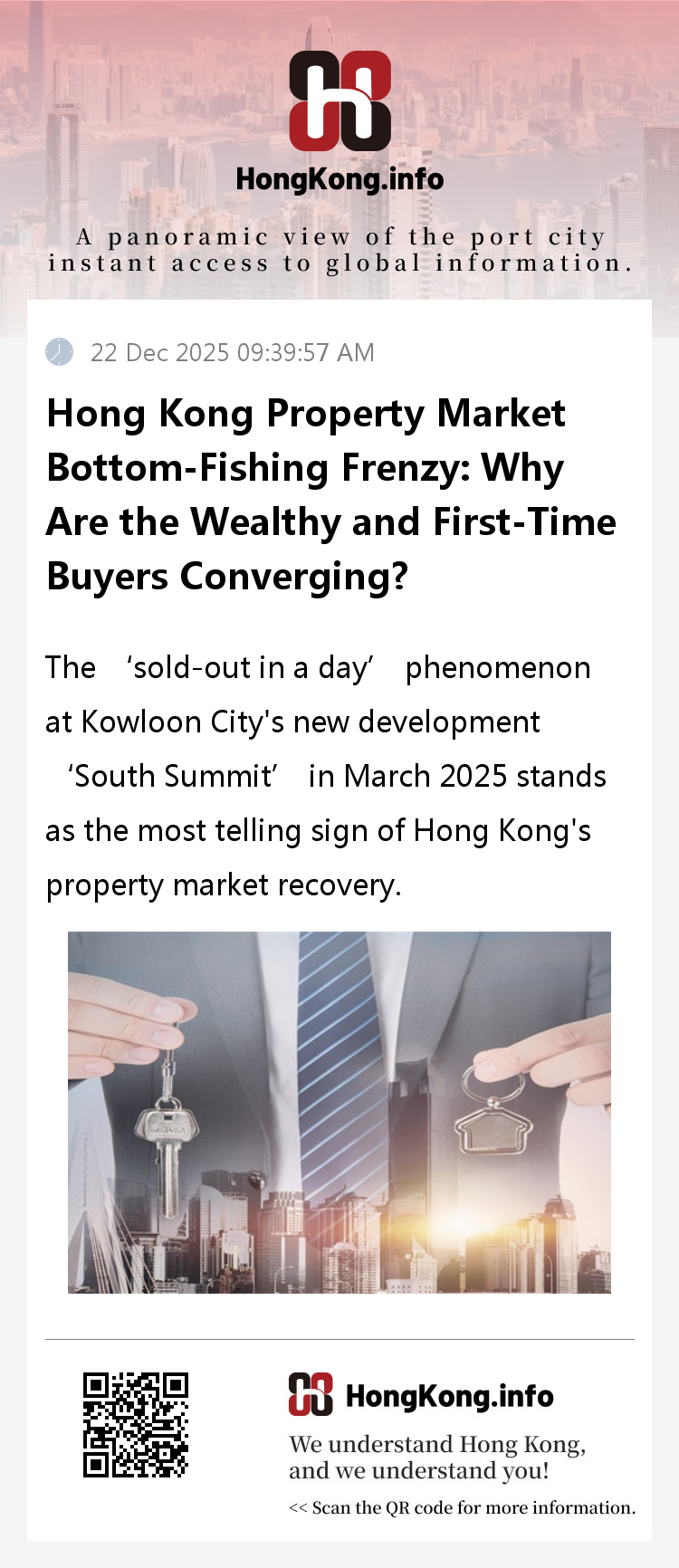 The mythical “sunlight” phenomenon at Kowloon City's new development “South Summit” in March 2025 stands as the most telling testament to Hong Kong's property market recovery—181 units drew 7,000 applicants, with 37 contenders vying for each flat. This fever pitch prompted many locals to exclaim: ‘The window for first-time buyers has truly opened.’ More intriguingly, while mainland migrants and local white-collar workers queued overnight for these affordable flats, luxury properties in Repulse Bay and Mid-Levels also saw frequent high-value transactions: Mainland internet tycoons snapped up a standalone villa in Deep Water Bay for HK$480 million, while Zhang Yong acquired a Mid-Levels flat for HK$53.54 million. This convergence of wealthy investors and first-time buyers seeking bargains is reshaping Hong Kong's property landscape.