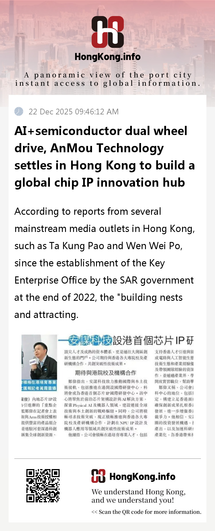 According to reports from several mainstream media outlets in Hong Kong, such as Ta Kung Pao and Wen Wei Po, since the establishment of the Key Enterprise Office by the SAR government at the end of 2022, the "building nests and attracting phoenixes" strategy for attracting investment in science and technology innovation has yielded fruitful results. As a key benchmark enterprise introduced by the office, AnMou Technology announced that its first international R&D center for chip IP in Hong Kong will officially settle in 2026. This layout not only fills the gap in the international R&D platform for chip IP in Hong Kong, but also injects strong momentum into the development of new quality productivity in Hong Kong. Zou Wei, Senior Technical Director of Anmou Technology, revealed that the R&D center will form a professional team of over 100 people in the next three years, focusing on cutting-edge chip architecture design and AI solution research and development, deeply cultivating the integration of physical AI and robotics technology, and creating a strategic hub connecting global innovation resources with the industrial needs of the Guangdong Hong Kong Macao Greater Bay Area. At present, the company has initiated cooperation and docking with various universities and research institutions in Hong Kong, focusing on core areas such as NPU IP design and robot applications, and tackling key technological breakthroughs.