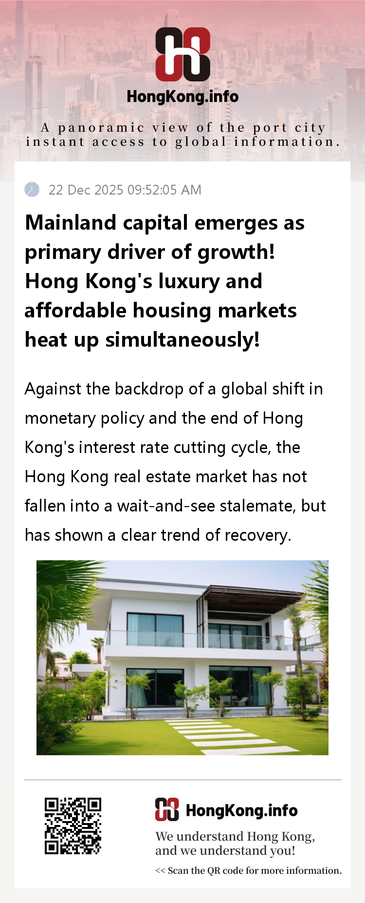 Against the backdrop of a global monetary policy shift and Hong Kong's interest rate reduction cycle reaching its conclusion, the property market has not fallen into a stalemate of caution but instead exhibits a pronounced recovery trend. The sustained influx of mainland capital has emerged as the primary growth driver, not only invigorating transactions in the luxury property segment but also spurring increased activity in the affordable housing market. This momentum is further bolstered by mainland internet giants' concentrated efforts to acquire prime office space in central districts, injecting robust confidence into Hong Kong's property sector.