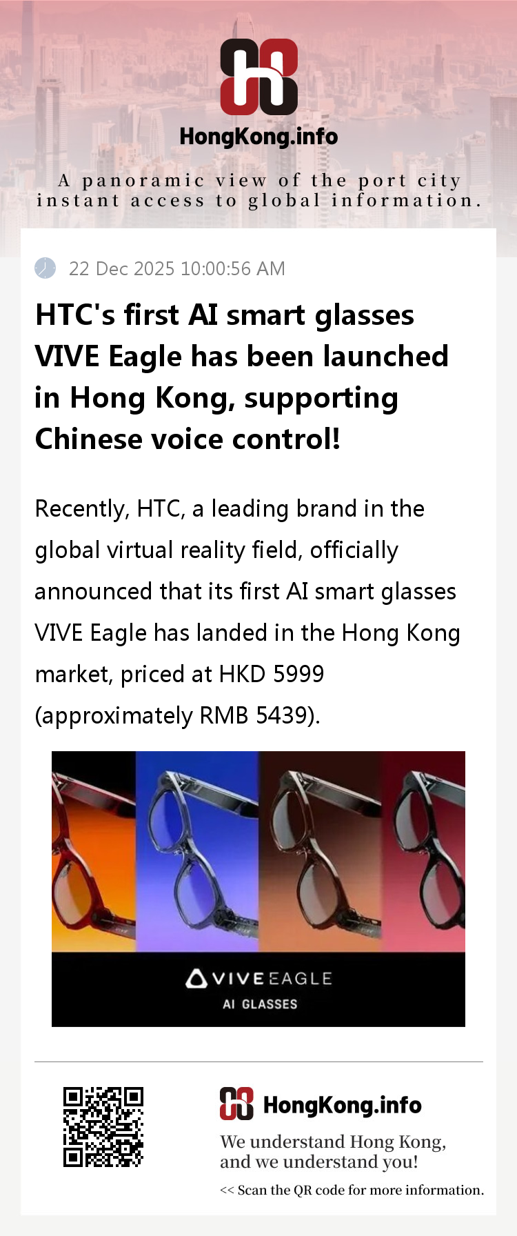 The landing of VIVE Eagle in Hong Kong not only fills the gap of high-end AI smart glasses that support Chinese voice in the local market, but also injects new vitality into the wearable device market with its core advantages of "fashionable design+practical functions+local adaptation". At present, the product has been fully launched for sale, and mainland consumers can also place orders by paying a shipping fee of HKD 130. With the subsequent launch of Cantonese voice control, VIVE Eagle is expected to further cultivate the Hong Kong market, promote the popularization of AI wearable technology in various scenarios such as daily life, tourism, and office, and open a new chapter of intelligent wearable technology in Hong Kong.