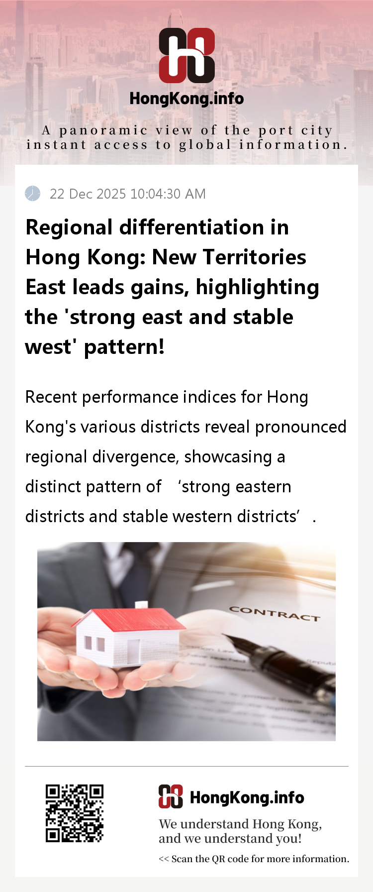 Overall, the performance of Hong Kong's regional indices in this period clearly delineates a pattern of ‘strong east, stable west’. The leading growth in the Eastern New Territories, closely followed by Hong Kong Island, highlights the eastern regions' advantages in development potential and demand support. Meanwhile, the moderate increases in Kowloon and the Western New Territories ensure the overall stability of the city's market. Looking ahead, as regional planning continues to advance and supporting facilities are progressively enhanced, whether the divergence in Hong Kong's regional markets will change warrants ongoing attention.