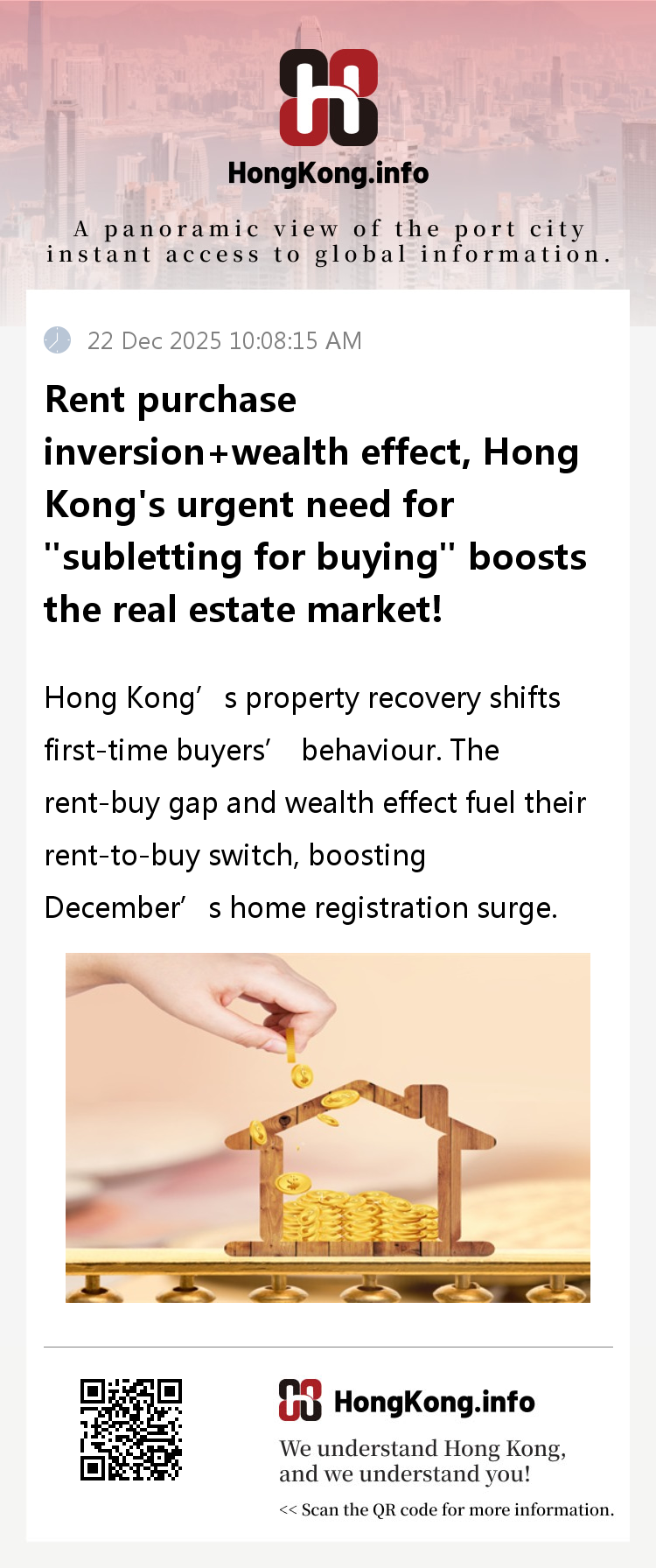 Against the backdrop of Hong Kong's property market recovery, first-time buyers' purchasing behaviour has shifted. The intensifying rent-to-buy disparity coupled with the release of wealth effects has driven first-time buyers to ‘switch from renting to buying’, becoming the key driver behind December's surge in residential property registrations.