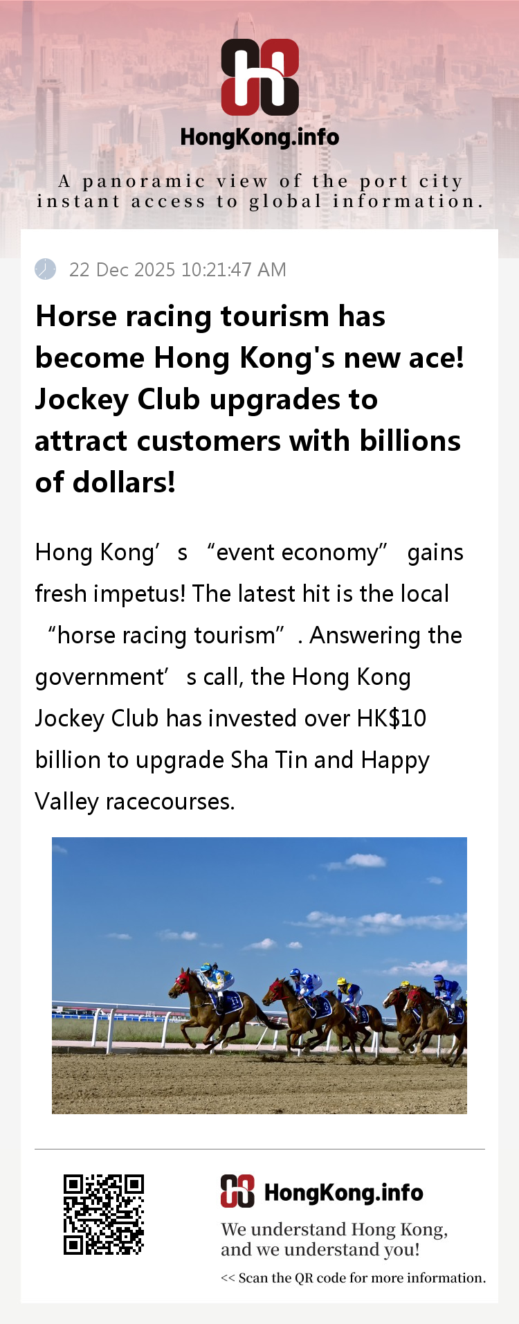 Hong Kong's “event economy” gains fresh impetus! The latest sensation is the uniquely local “horse racing tourism”. Responding to the government's call, the Hong Kong Jockey Club has invested over HK$10 billion to upgrade Sha Tin and Happy Valley racecourses. This has successfully attracted large numbers of visitors travelling specifically to experience Hong Kong's horse racing culture, creating a new highlight for the city's tourism!