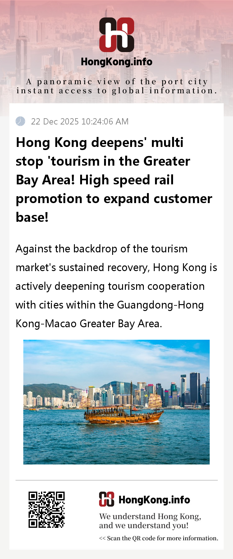 Against the backdrop of the tourism market's sustained recovery, Hong Kong is actively deepening tourism cooperation with cities within the Guangdong-Hong Kong-Macao Greater Bay Area. The focus is on promoting multi-destination itineraries, leveraging the complementary resources of Bay Area cities to attract international travellers to enter the Greater Bay Area via Hong Kong. This aims to create a more compelling cluster of tourist destinations. Concurrently, the Hong Kong Tourism Board is implementing targeted initiatives, extensively promoting Hong Kong's diverse events and attractions on high-speed rail services to broaden visitor sources and inject fresh vitality into the tourism market.
