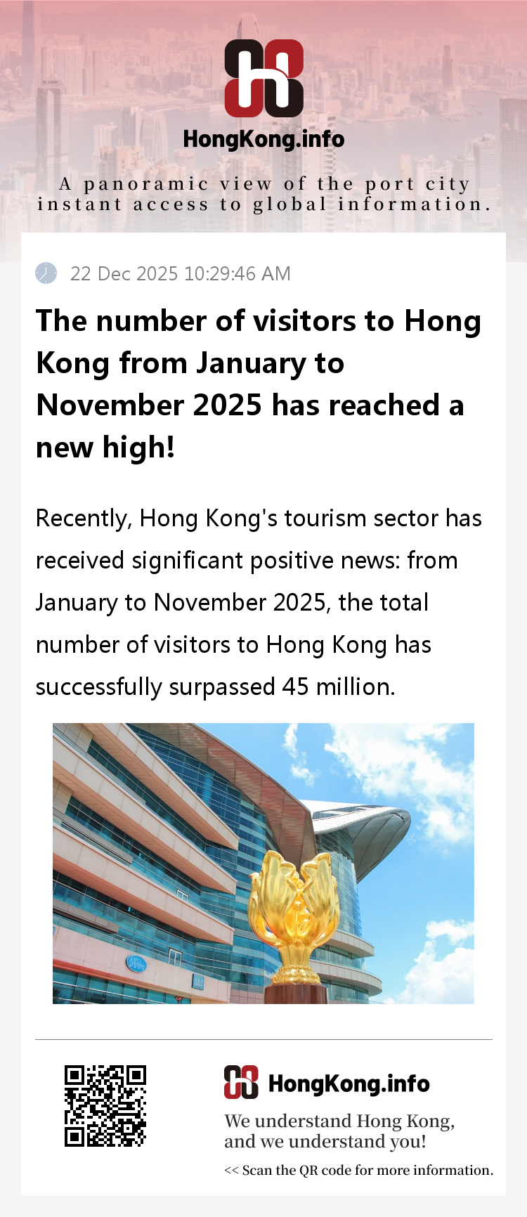 Recently, Hong Kong's tourism sector has received significant positive news: from January to November 2025, the total number of visitors to Hong Kong has successfully surpassed 45 million. This achievement not only exceeds the 40 million visitor total for the entire year of 2024 one month ahead of schedule but also demonstrates robust recovery and growth momentum. Notably, November alone saw 4.2 million visitors, marking a 17% year-on-year increase and setting a new monthly record. This achievement injects robust confidence into the year-end performance of Hong Kong's tourism sector.