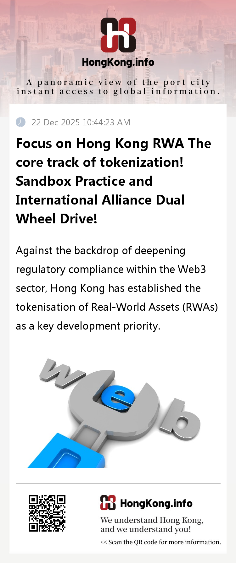 Against the backdrop of deepening regulatory compliance within the Web3 sector, Hong Kong has established the tokenisation of Real-World Assets (RWAs) as a key development priority. Through multi-dimensional efforts encompassing policy guidance, regulatory sandbox initiatives and international collaboration, it is driving the digital transformation of tangible assets such as green bonds, carbon credits and real estate. This accelerates the construction of a cross-border digital asset ecosystem, further consolidating the international financial centre's leading position in emerging financial domains.