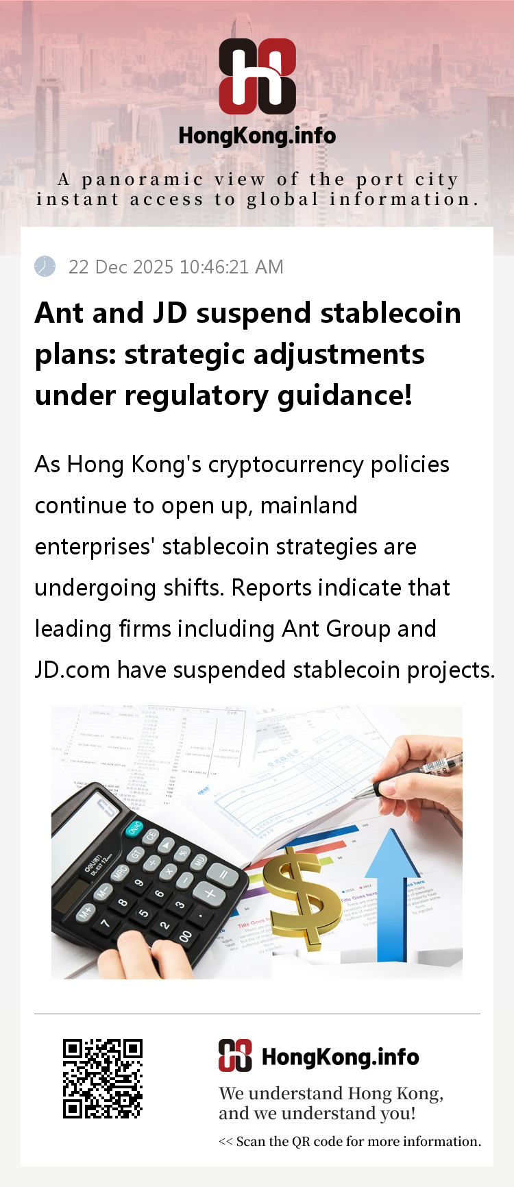 As Hong Kong's cryptocurrency policies continue to open up, mainland enterprises' stablecoin strategies are undergoing shifts. Reports indicate that leading firms including Ant Group and JD.com have suspended stablecoin projects, primarily due to explicit regulatory directives from mainland authorities instructing them ‘not to proceed’. Market analysis suggests the suspension stems from a potential strategic conflict between renminbi-pegged stablecoins and the digital renminbi (e-CNY). Regulators are exercising prudent oversight over enterprise-led stablecoin initiatives to safeguard financial stability and ensure the smooth rollout of the official digital currency.