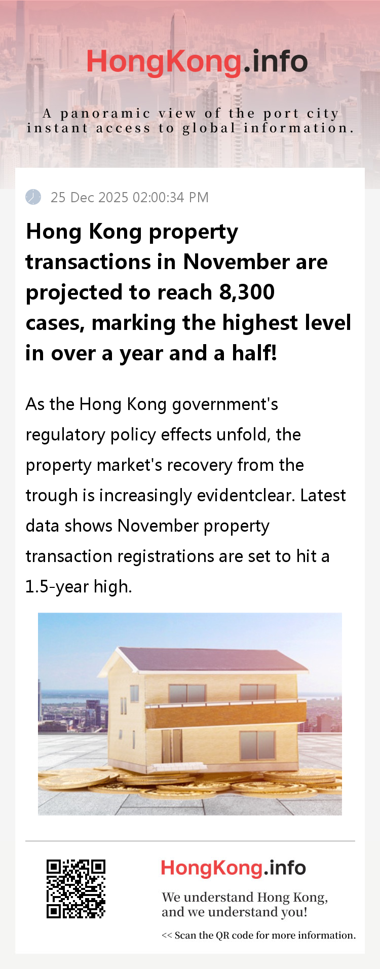 Yang Mingyi, Senior Associate Director of Research at Centaline Property, noted that based on current market performance projections, the total number of registered property sale contracts for November is expected to reach approximately 8,300, involving a transaction value of HK$62 billion. This represents increases of 16.6% and 6.1% respectively compared to October. Notably, in terms of transaction volume, this figure would mark a 20-month high since April last year – surpassing the peak recorded over a year and a half ago. By transaction value, it would also represent the highest level in nearly six months since June this year, signifying the most active period in the property market since the initial phase of the government's comprehensive withdrawal of cooling measures.