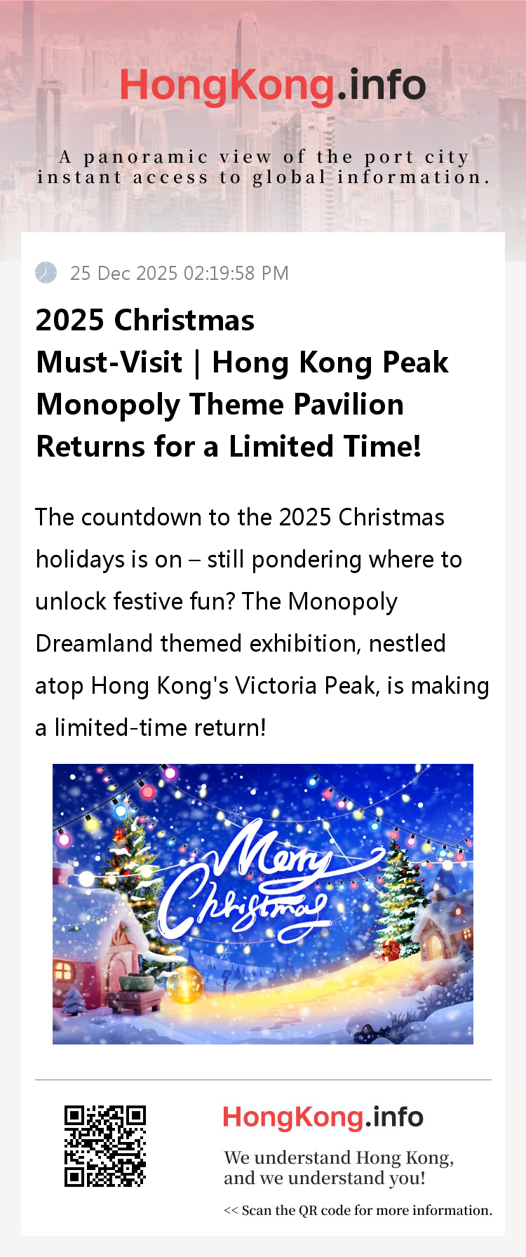 Surrounding Attractions: After visiting the themed exhibition, do not miss the exclusive Christmas vistas at the Peak. The rooftop viewing platform at Peak Galleria is freely accessible, offering panoramic views of Victoria Harbour's dazzling nightscape and festive illuminations. Nearby Hong Kong-style cafés serve local delicacies such as egg tarts and wonton noodles, while souvenir shops offer Christmas gifts. If time permits, extend your experience to Sky Terrace 428 at The Peak Tower for panoramic views of Hong Kong Island's festive nightscape, completing your visit.