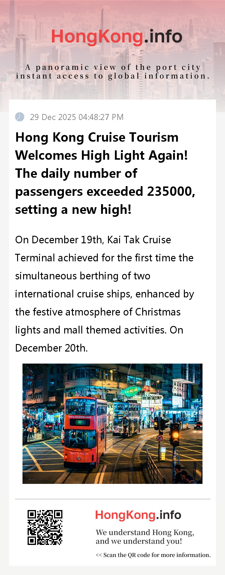 As the core hub of Hong Kong's cruise tourism, the "dual ship berthing" at Kai Tak Cruise Terminal is a milestone. On December 19th, two international cruise ships simultaneously docked at the terminal, marking the first time since the operation of the Kai Tak Cruise Terminal that this operational scenario has been achieved, and marking a new level of reception capacity and operational level for the terminal. Two international cruise ships have brought a large number of international tourists, injecting strong tourism consumption vitality into Hong Kong.