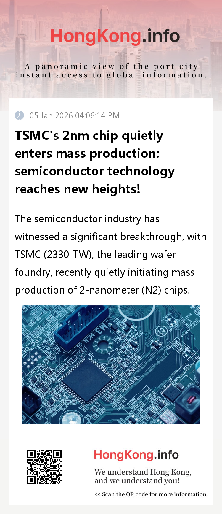 It is understood that TSMC has made a low-key official announcement on its 2nm technology webpage, stating that "2nm (N2) technology has been mass-produced as planned in the fourth quarter of 2025." This announcement fits its steady and calm style and confirms the certainty of mass production. 2nm is one of the most advanced semiconductor manufacturing processes globally, and mass production requires overcoming multiple technical challenges such as materials and lithography. This milestone further consolidates TSMC's global leadership in the field of advanced manufacturing processes.