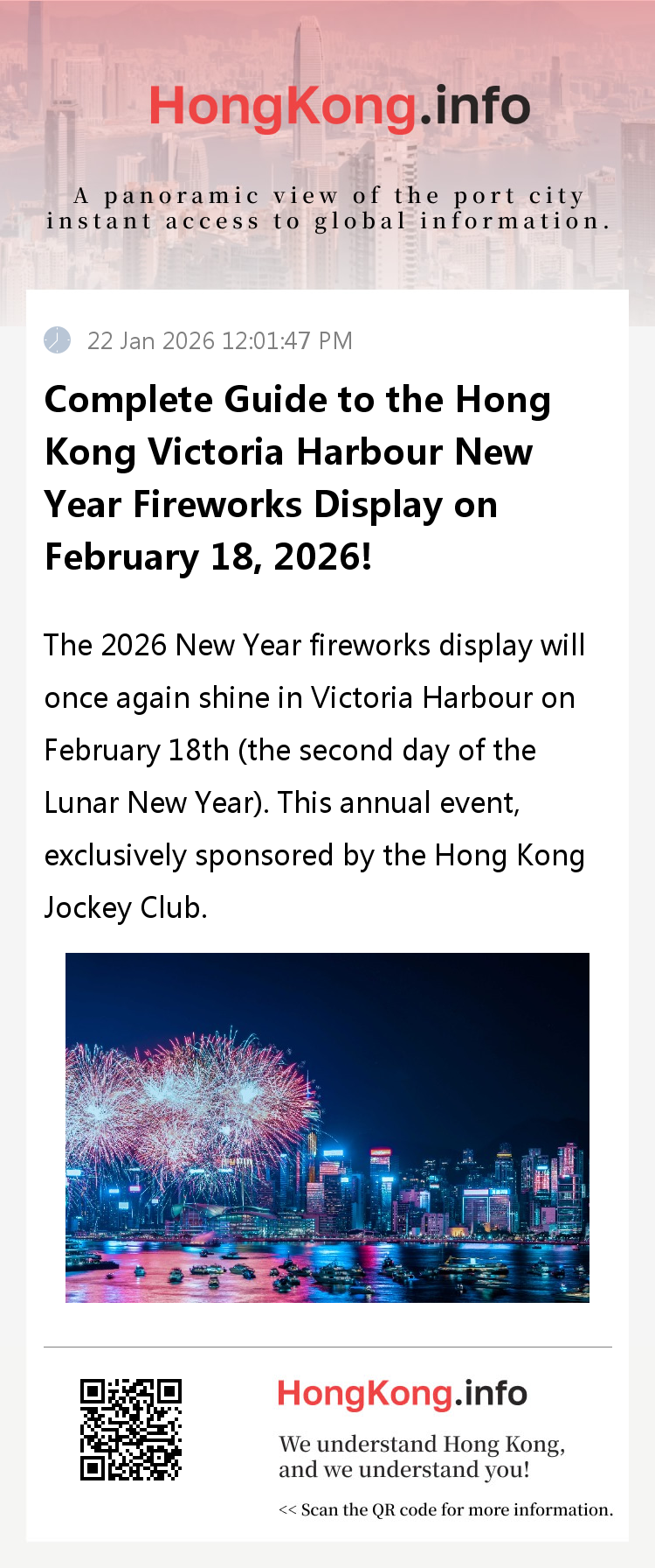 The theme of this New Year fireworks display is "Dragon and Horse Launch, Fragrant River Shines with Colors", closely following the atmosphere of the 2026 Chinese New Year of the Horse, and using dazzling fireworks to convey beautiful expectations. The performance will be held on February 18th (the second day of the Lunar New Year) at 20:00 sharp, lasting about 23 minutes. The whole process is divided into 8 chapters, accompanied by carefully arranged background music, creating a dual feast of audio and visual. The fireworks launch point is located in the central sea area of Victoria Harbour, with iconic buildings such as the Hong Kong Convention and Exhibition Centre and the Central IFC as the background, forming a beautiful scene of "fireworks reflecting landmarks". The viewing range covers the core areas on both sides of Victoria Harbour, whether it is the Tsim Sha Tsui waterfront or the Causeway Bay typhoon shelter, stunning scenery can be encountered.