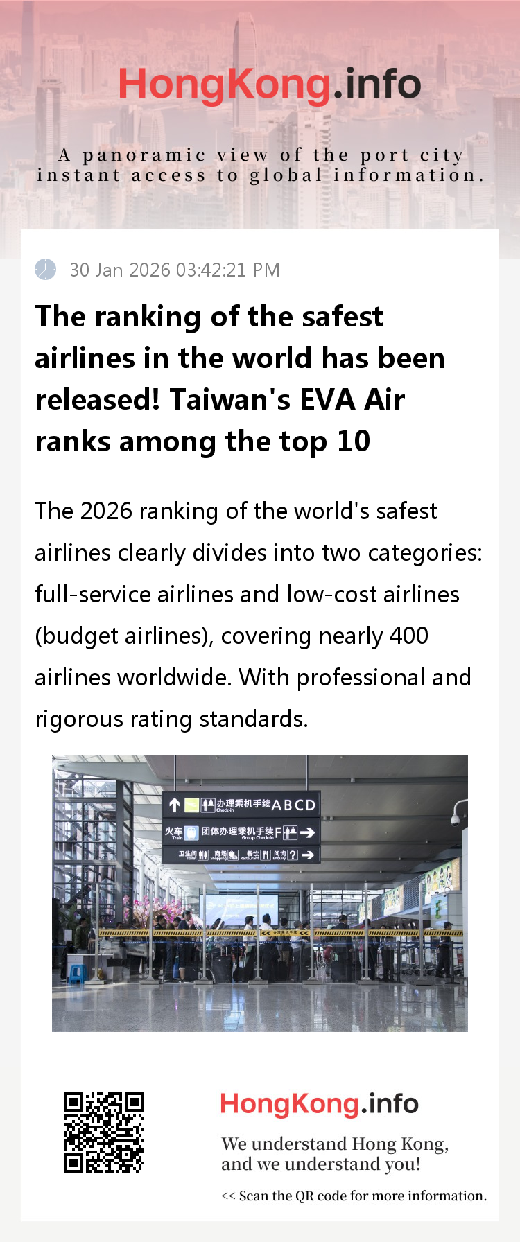 In this ranking, Middle Eastern airlines performed outstandingly and occupied the top of the list. Taiwan's EVA Air, with its long-term stable safety performance, successfully entered the top 10 in the world, becoming the only airline in Taiwan to be included in the top 10. The budget airline list was also released simultaneously, and Hong Kong Express Airways remained the world's number one, attracting widespread attention in the industry.