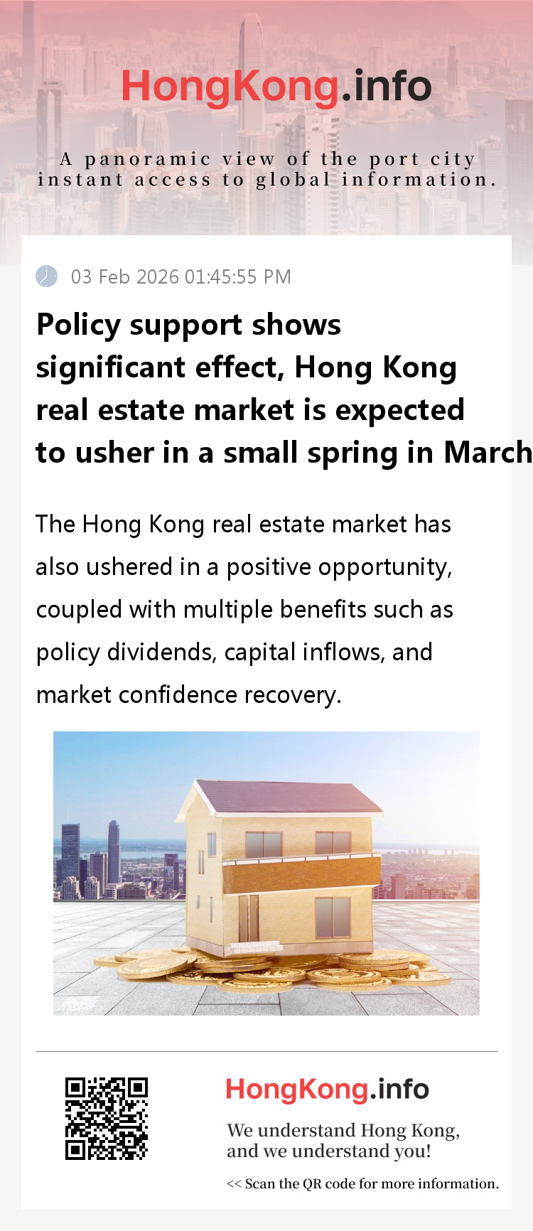 The stability and progress of the mainland real estate market are in line with the positive trend of the Hong Kong real estate market, coupled with local favorable factors in Hong Kong, jointly promoting the steady progress of the Hong Kong real estate market towards a "little spring". Recently, there have been multiple positive signals in the Hong Kong real estate market, the most obvious of which is the booming mortgage market. According to data from Zhongyuan Mortgage, there were 7852 registered mortgages for existing properties in Hong Kong in January 2026, an increase of 60.5% compared to the previous month, setting a new high for 31 months since June 2023. This fully reflects the accelerating release of housing demand in the market and the continuous recovery of buyers' confidence in entering the market.