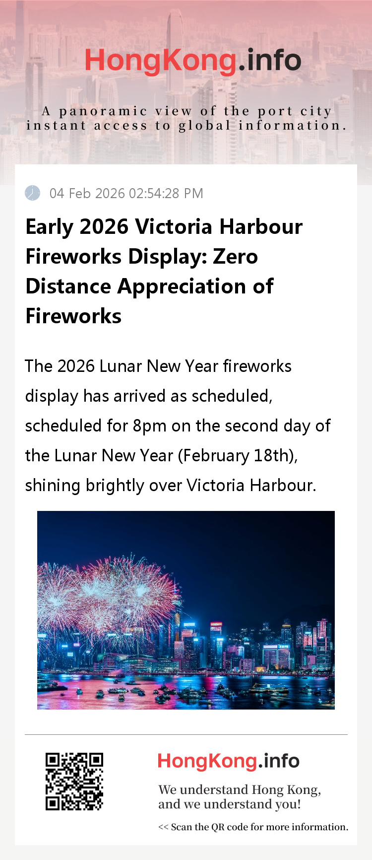 The fireworks display is 850 meters wide and 250 meters high, coordinated by three barges and six floating boats. Each scene has a unique meaning of the Year of the Horse: the first scene, "The Horse Departs," uses 15 seconds of high-density fireworks to create a majestic atmosphere of ten thousand galloping horses, opening the curtain of the performance; The second act, "Celebrating the New Year Together," will display fireworks in the shape of an "8" and a "gold ingot," symbolizing abundant wealth and prosperous homes; The eighth act of the finale, "Success on the Move," will shock the night sky with large "Golden Crown" fireworks and high-density fireworks, wishing the motherland prosperity and success and Hong Kong success. In addition, the prelude of the performance will also feature fireworks with the words "HKCC" and "WIN", full of details and a sense of ceremony.