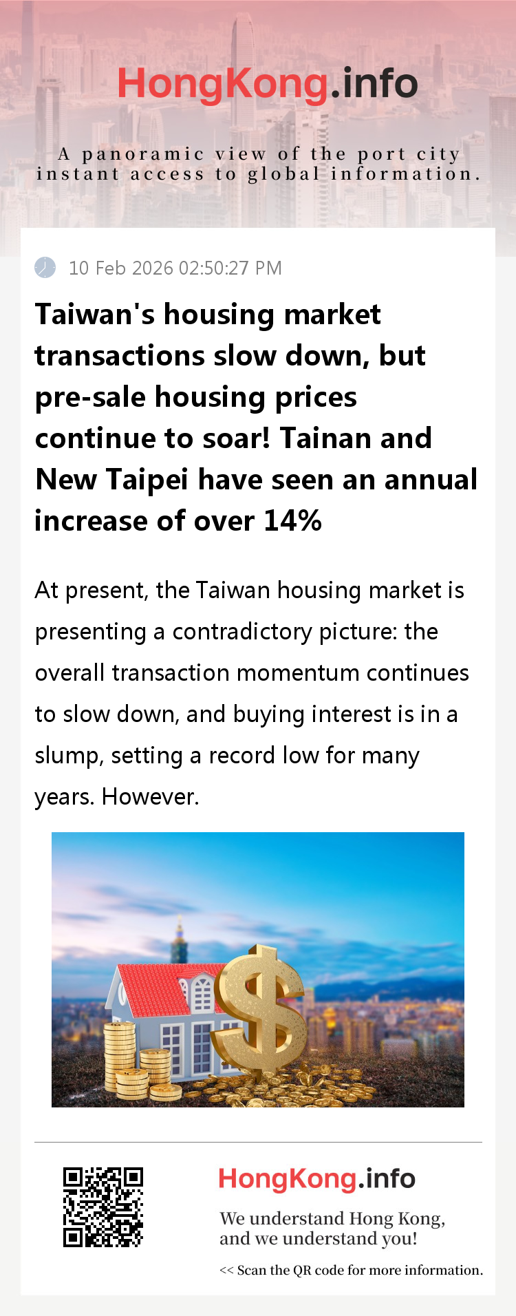 The Hong Kong Insurance Regulatory Authority plans to introduce new regulations: the real price registration data of quasi insurance companies investing in cryptocurrencies clearly outlines this contrasting trend: although the number of properties sold and transferred in the Taiwan real estate market has hit a new low in 9 years, with a decrease of 25.5% from 2024 in 2025, and the total sales of the top ten developers have also shrunk by more than 29%, the pre-sale housing market has emerged as an independent market, with the average pre-sale housing prices in all six cities achieving year-on-year increases, and the contrast between hot and cold is extremely clear. Among them, Tainan has the most prominent increase, becoming the "leader" among the six major cities. The average unit price of pre-sale houses has steadily risen from 357000 yuan per ping in 2024 to 409000 yuan per ping in 2025, with an annual increase of 14.6%. The unit price per ping has increased by more than 50000 yuan, leading the growth rate in Taiwan.