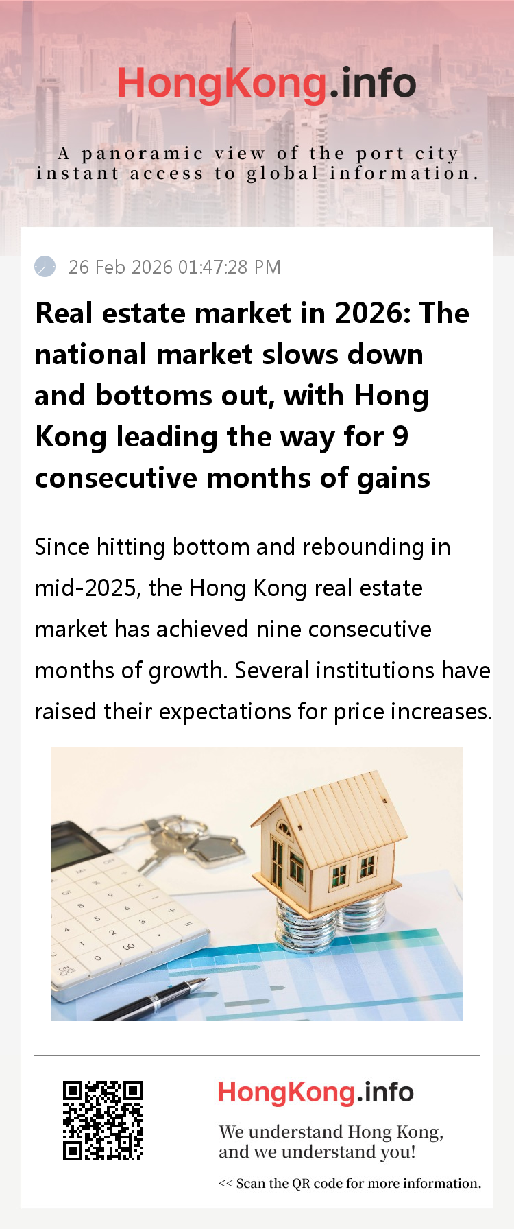 The Hong Kong property market has rebounded since hitting bottom in June 2025 and has been rising for nine consecutive months as of February 2026. According to data from the Special Administrative Region government, the price index of private residential properties in January 2026 was 301.4 (the highest since June 2024), an increase of 0.53% month on month, with a cumulative increase of over 8% in 9 months, highlighting the outstanding performance of the luxury housing sector.