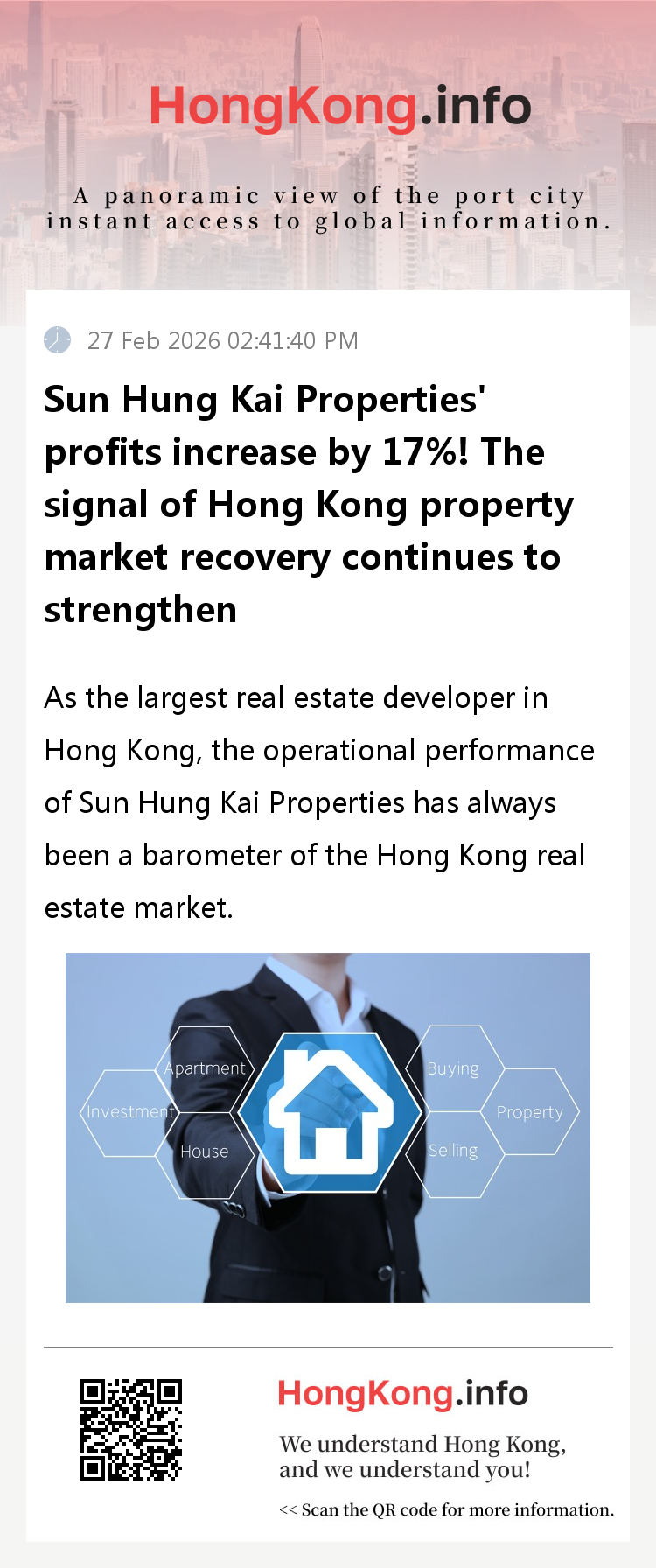 Recently, Sun Hung Kai Properties released an announcement on the Hong Kong Stock Exchange, disclosing its operating data for the first half of the year as of December 31. The company's basic profit, excluding property revaluation gains, increased by 17% year-on-year, reaching HKD 12.2 billion (approximately USD 1.6 billion). At the same time, its mid-term dividend increased by 3%, delivering an impressive business performance. This performance growth not only demonstrates the company's own operational resilience, but also serves as another strong evidence of the sustained recovery of the Hong Kong real estate market, further releasing a positive signal of market recovery.
