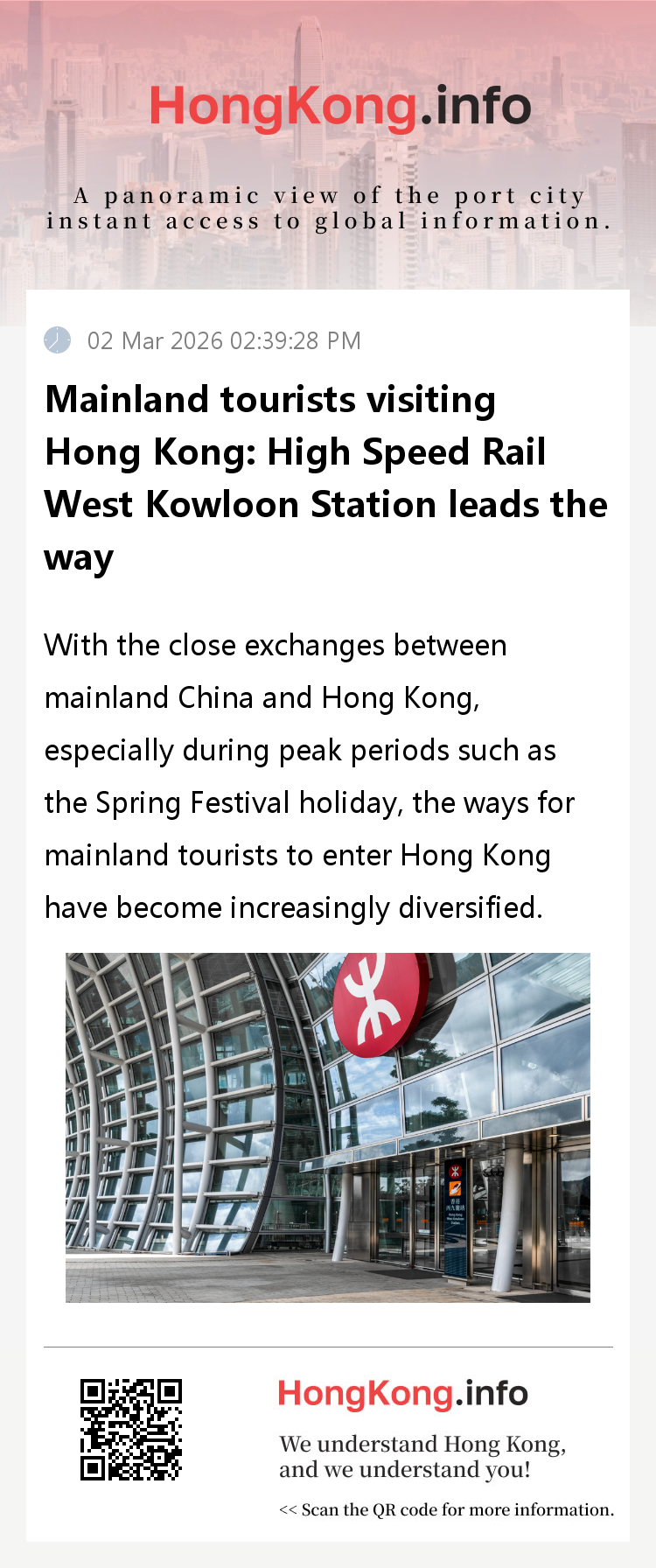 The diversified characteristics of mainland tourists entering Hong Kong are becoming increasingly evident, with multiple modes of transportation such as railways and highways complementing each other to meet the travel needs of different passengers. The West Kowloon Station of the high-speed railway stands out as the core hub of peak passenger flow. As the core station of the Hong Kong section of the Guangzhou Shenzhen Hong Kong high-speed railway, West Kowloon Station adopts the "one place, two inspections" transit method, allowing passengers to complete the procedures for mainland exit and Hong Kong entry in one go without transferring midway. This greatly shortens the clearance time. In addition, its independently developed passenger flow guidance and prediction system further improves the clearance efficiency during peak hours, enabling passengers to achieve "fast clearance and convenient travel". During the Spring Festival holiday, the number of mainland tourists entering Hong Kong through the West Kowloon Station of the high-speed railway reached 326800, with an average daily passenger flow of over 36000. With the advantages of high efficiency and convenience, it remained the most popular port of entry in Hong Kong, demonstrating the core role of railway transportation in cross-border travel.