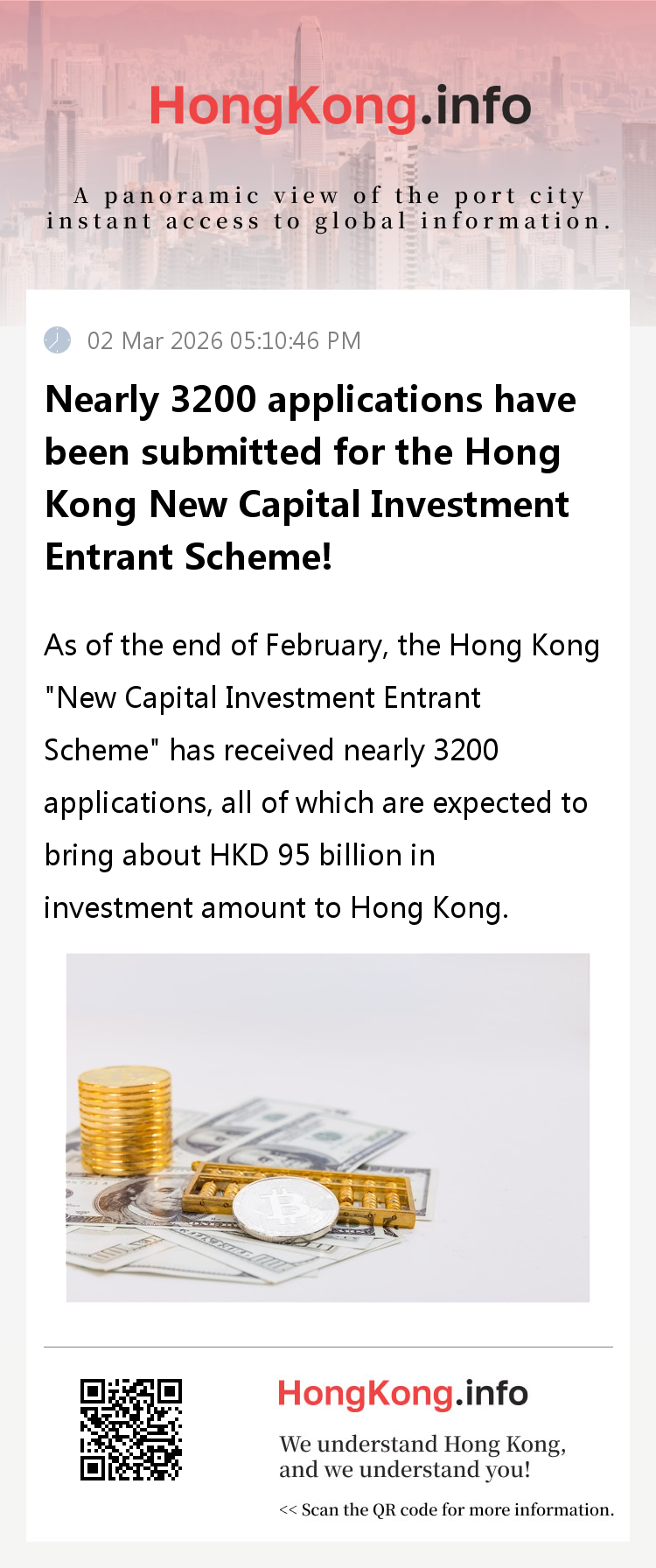 The relevant person in charge of the Hong Kong Special Administrative Region government stated that the enthusiastic response of the New Capital Investment Entrant Scheme highlights Hong Kong's unique advantages as an international top investment hub. In the future, the SAR government will continue to optimize relevant policies, attract more outstanding talents and funds from around the world to Hong Kong, and promote the sustained and stable development of the Hong Kong economy.