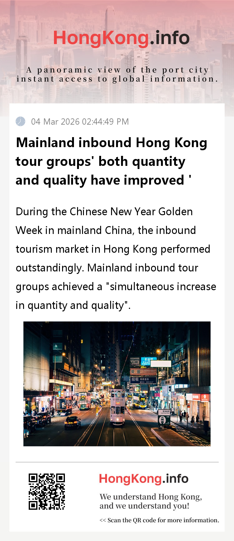 The simultaneous increase in both quantity and quality of tour groups is the result of multiple factors: the extension of the Chinese New Year holiday in mainland China and the increased attractiveness of festive events such as fireworks displays and float parades in Victoria Harbour, Hong Kong; At the same time, Hong Kong optimizes its tourism services, enriches high-quality products, meets the immersive experience needs of mainland tourists, and showcases its charm as a tourist destination.