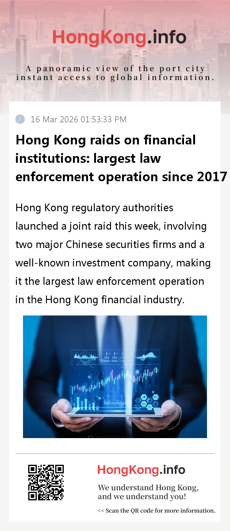 This large-scale raid is driven by the continuous upgrading of Hong Kong's financial regulatory efforts. In recent years, with the surge in trading volume in the Hong Kong capital market, initial public offering (IPO) activities have gradually heated up, and various trading behaviors have become increasingly complex. The potential risk of market violations has also increased. Therefore, regulatory authorities have further strengthened their scrutiny of related transactions, focusing on illegal and irregular behaviors such as insider trading and commercial bribery, and building a strong defense line for the safety of the capital market. As an Asian financial center, Hong Kong has always focused on maintaining market fairness, transparency, and order. This largest law enforcement action since 2017 not only serves as a severe deterrent to illegal and irregular behavior, but also sends a clear signal to the market that regulatory authorities will continue to strengthen law enforcement efforts, crack down on various types of capital market chaos, and protect the legitimate rights and interests of investors.
