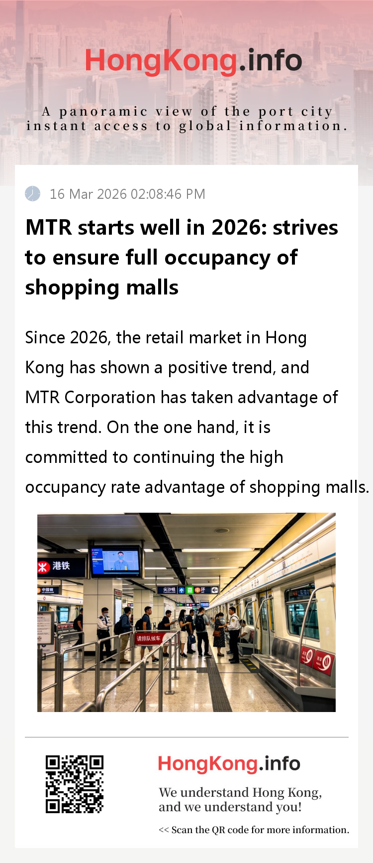 Overall, in 2026, MTR will have a good start, with retail recovery supporting mall operations, orderly progress of property projects contributing to profits, and losses in train services will be alleviated under the support of core models. In the future, MTR will adhere to a prudent strategy, promote multi business collaboration, ensure public transportation supply, and achieve sustainable development.