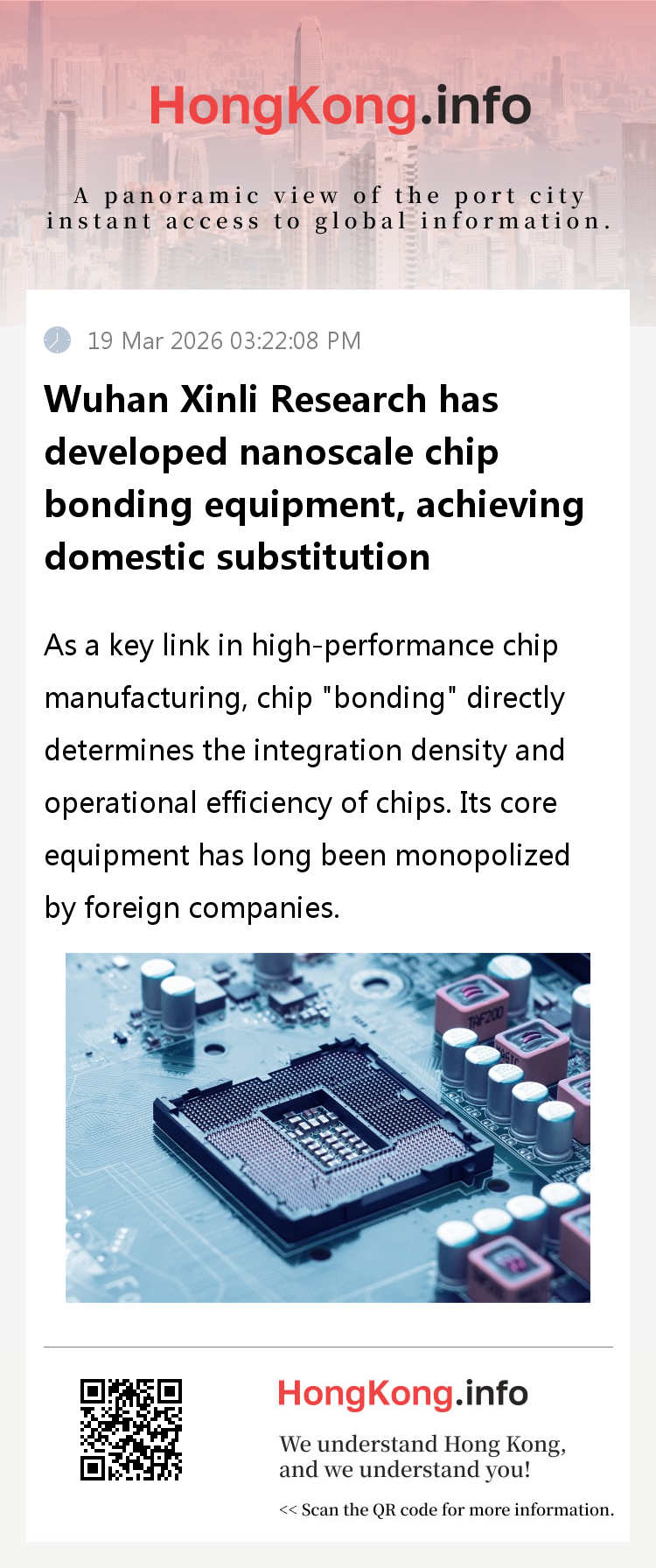 Chip bonding is the core process of the packaging and testing stage after chip manufacturing, which is like building a bridge for chips. It requires precise calibration and bonding of multiple wafers or chips at the nanoscale precision to achieve atomic level integration, directly affecting the performance, volume, and reliability of chips. It is the core support of advanced packaging technology and widely used in fields such as AI chips, high-performance computing, and vehicle control chips. For a long time, the global market for high-end chip bonding equipment has been dominated by European, American, and Japanese companies. Domestic chip manufacturing companies can only rely on imports, which not only result in high procurement costs, but also face risks such as technology blockades and supply restrictions, seriously restricting the independent and controllable development of China's chip industry.