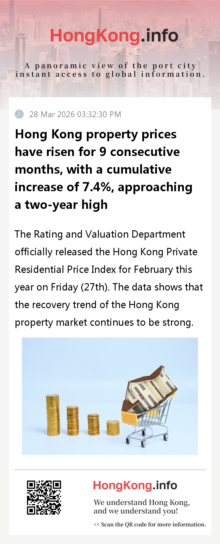 According to the released data, the overall price index of private residential properties in Hong Kong was 307.6 points in February this year, which is a nearly two-year high since reaching 309.6 points in April 2024 and only one step away from the previous peak. It is worth noting that the index has steadily risen for 9 consecutive months, with a cumulative increase of 7.36%, indicating that the Hong Kong property market has entered a sustained recovery channel since June 2025, and there are clear signs of market recovery.