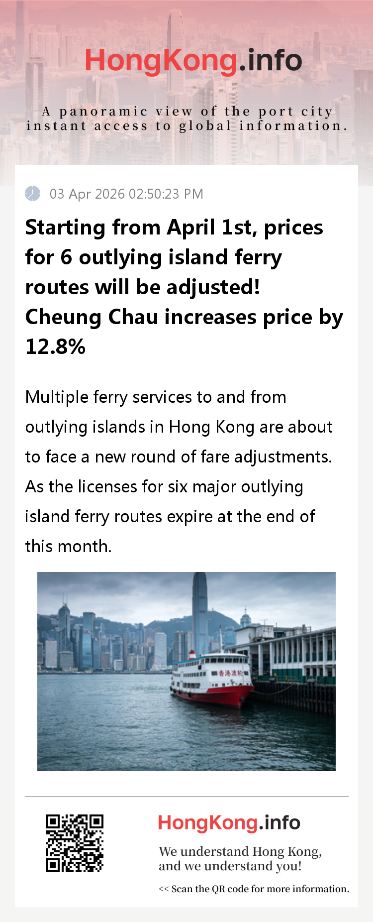 The six routes involved in the fare adjustment this time are all core transportation routes for Hong Kong citizens traveling to and from the outlying islands, operated by two operators, New World First Ferry and Hong Kong and Kowloon Ferry. Due to the expiration of the existing service license at the end of March, the Transport Department has approved the renewal of the licenses for the two companies for 5 years and simultaneously initiated fare adjustments after completing relevant reviews.