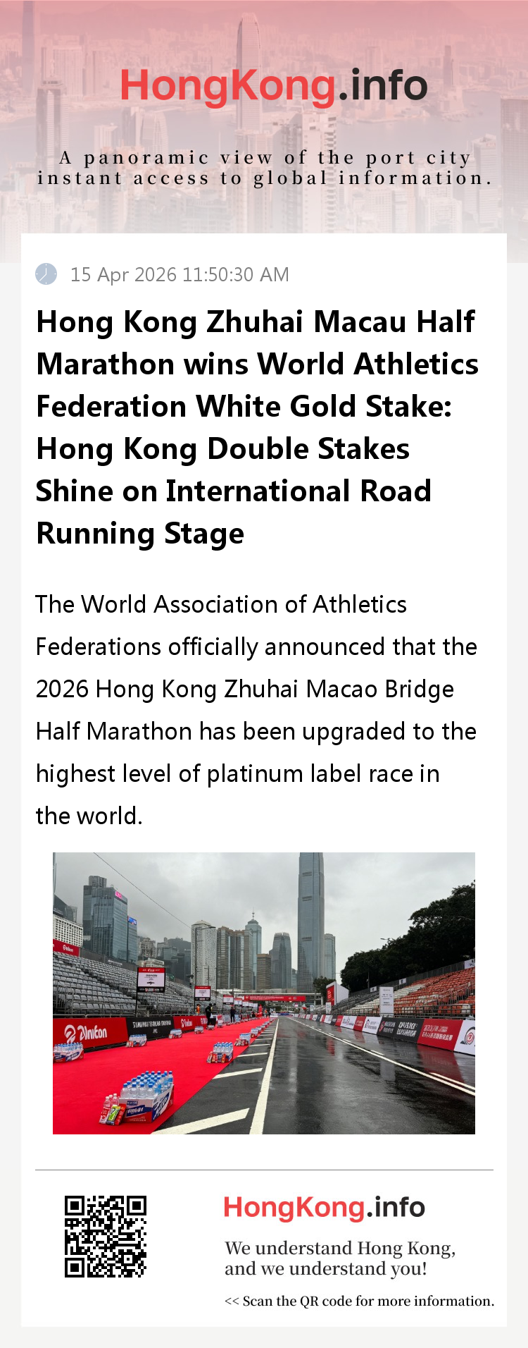 The World Association of Athletics Federations Platinum Label is the "ceiling" certification for road running events, representing the world's most stringent racing standards. The Hong Kong Zhuhai Macau Half Marathon has risen from the gold label to the platinum label, which means that it has reached the world's top level in all aspects such as elite athlete lineup, event operation, safety protection, medical services, global broadcasting, and brand influence.