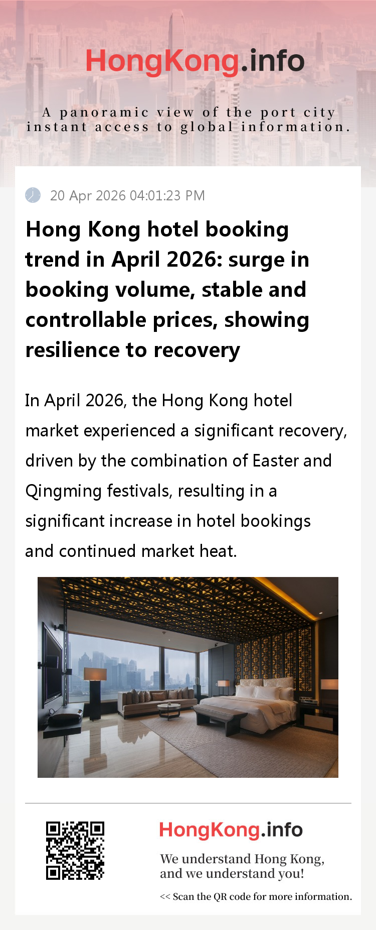 From the perspective of customer source structure, it presents a distinct feature of "two-way travel": on the one hand, a large number of Hong Kong residents choose to travel north to the mainland for vacation, which drives a short-term surge in hotel bookings from Hong Kong's departure destinations; On the other hand, mainland tourists took advantage of the Qingming Festival holiday to travel to Hong Kong, with hotel bookings in core business districts such as Tsim Sha Tsui, Causeway Bay, and Central being the first to reach saturation. The growth rate of bookings for family suites, parent-child themed rooms, and other room types was particularly significant, becoming an important driving force for the increase in bookings. In addition, the hosting of international events in late April further continued the market heat, driving high monthly bookings.