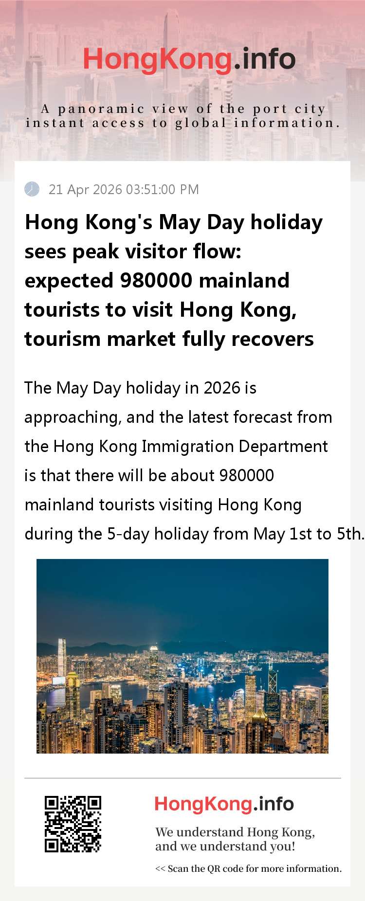The steady increase in the number of mainland tourists visiting Hong Kong during the May Day holiday is a direct reflection of the sustained recovery of Hong Kong's tourism industry. Since the beginning of this year, the popularity of Hong Kong tourists visiting Hong Kong has remained high. In the first quarter, the number of mainland tourists visiting Hong Kong has exceeded 11 million, an increase of 20% year-on-year, laying a solid foundation for the growth of holiday passenger flow. The expected number of visitors of 980000 and a year-on-year increase of 7% not only reflect the continuous favor of mainland tourists towards Hong Kong's cultural and tourism resources, but also reflect the positive effects brought by the facilitation of customs clearance and optimization of the tourism environment between the two places.